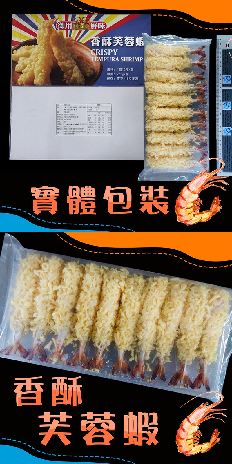 精選彈牙大蝦,裹上金黃酥脆芙蓉麵衣,油炸或氣炸即可輕鬆上桌。每尾蝦肉鮮甜飽滿,外層香酥不膩,口感層次豐富,宛如餐廳現炸的天婦羅炸蝦。無論是家庭聚餐、派對小食,或搭配日式料理擺盤,都能瞬間升級餐桌質感。冷凍保存、免退冰即可料理,讓你輕鬆享受大廚級美味! 商品品名:香酥芙蓉蝦 商品組合/規格:1盒, 10尾 淨重、容量.(含液商品需標註固形物):250g±/9g包 內容物成分(全展開)成分有豬及牛的需於背後標註產地:白蝦、水、麵粉、木薯澱粉、棕櫚油、酸處理澱粉、蝦粉、鹽、糖 原產地(國):越南 製造廠商或國內負責廠商名稱:好神國際股份有限公司 製造廠商或國內負責廠商地址:新北市中和區新民街94巷11號 製造廠商或國內負責廠商電話:02-82267886 保存期限:冷凍保存12個月(有效日期: 標示於包裝上) 食品業者登錄字號:H-154230747-00000-7 投保產品責任險字號:第一產物保險產品責任險保單號1000字第13PR000674號 過敏原:本產品含有甲殼類及含麩質之穀物及其製品,不適合對其過敏者食用 ※非供即食,應充分加熱 備註: 本產品屬"冷凍食品"無7天鑑賞期退換貨,敬請見諒。 好神國際所提供的產品配送區域範圍目前僅限台灣本島。 若商品無問題,因個人因素(口味、觀念、認知、料理方式問題),欲退換貨,需付物流處理費用250元,商品依溫層保存,外包裝保持原狀,如商品狀態受損者將影響退換貨權益。 商品顏色可能因各顯示器設定而有差異,依實際供貨商品為準。 基於食品衛生考量,除商品本身瑕疵外,商品一經拆封後,不可退貨,且退貨時請保留紙箱及商品,並於到貨後24小時內以電話、LINE@:@shg4038g或網站中的"聯絡我們",我們會盡全力協助您處理,謝謝。 商品之實際配貨日期、退換貨日期,依我們向您另行通知之內容為準。 收到退貨之商品且確認無誤後,7-14個工作天內辦理退款,款項將退回原訂購人或匯款轉帳人之帳號。