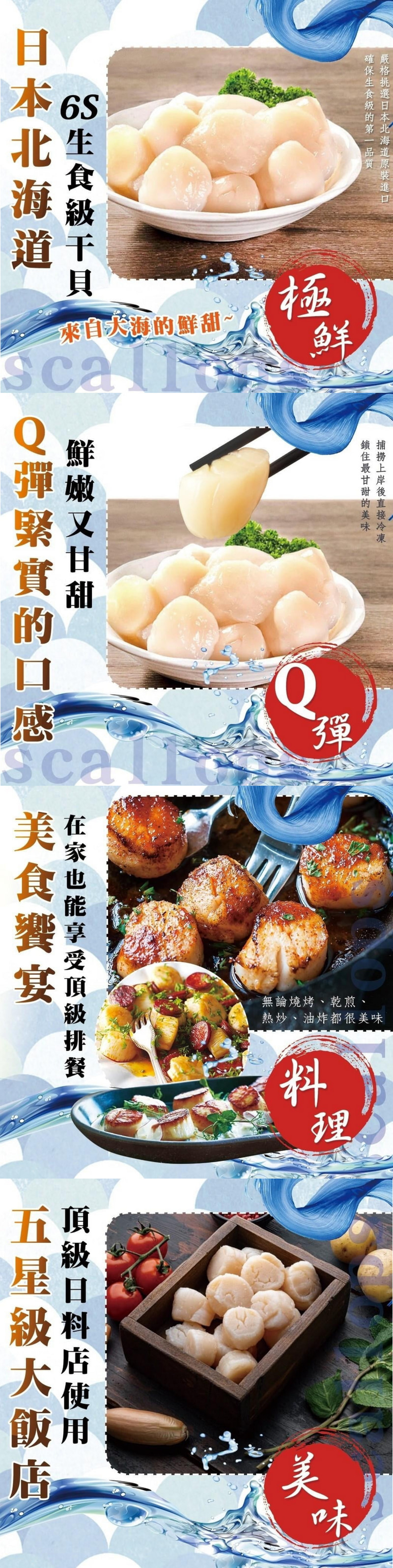嚴選日本原裝進口生食級大干貝,6S 規格大小均勻,肉質鮮嫩細緻,入口鮮甜多汁。1000g 豪華大份量,適合家庭聚餐或高端宴席,厚薄適中,料理方便。干貝鮮度極佳,烹調時能釋放自然海味,口感層次分明。無論是生食刺身、炙燒、煎烤或火鍋料理,都能展現干貝的極致鮮美。真空冷凍包裝完整保鮮,取用安心,無腥味、無添加,隨時享受純粹美味。這款日本嚴選生食級 6S 大干貝,是餐桌上不可或缺的豪華佳餚。 商品品名:日本嚴選生食級6S大干貝 商品組合/規格:80-100顆/包 淨重、容量、(含液商品需標註固形物):1000g±1.5% / 包,包冰率5% 內容物成分(全展開)成分有豬及牛的需於背後標註產地:干貝 原產地(國):日本北海道 製造廠商或國內負責廠商名稱:好神國際股份有限公司 製造廠商或國內負責廠商地址:新北市中和區新民街94巷11號 製造廠商或國內負責廠商電話:02-82267886 保存期限:冷凍保存12個月 食品業者登錄字號:H-154230747-00000-7 投保產品責任險字號:第一產物保險產品責任險保單號1000字第14PR000651號 過敏原: 不適合對其過敏者食用 ※由於肉品、海鮮及蔬菜等生鮮產品,天然生長大小本就有所差異,實際商品可能在外觀、形狀上略有不同。商品以「實際重量」為準,敬請理解並放心選購。 備註: 本產品屬"冷凍食品"無7天鑑賞期退換貨。 基於食品衛生考量,除商品本身瑕疵外,商品一經拆封後,不可退貨,且退貨時請保留紙箱及商品,並於到貨後24小時內以電話、LINE@:@shg4038g或網站中的"聯絡我們",我們會盡全力協助您處理,謝謝。 生鮮肉品皆為原裝進口原肉現切,故無任何添加及醃漬嫩化,如需軟嫰肉質,請自行斷筋及醃漬嫩化。 生鮮肉品因真空包裝缺氧,顏色呈暗紅色是正常現象。 宅配過程因商品碰撞可能導致失去真空效果,未退冰狀況下,並不影響商品的新鮮度,請放心食用! 好神國際所提供的產品配送區域範圍目前僅限台灣本島。 若商品無問題,因個人因素(口味、觀念、認知、料理方式問題),欲退換貨,需付物流處理費用250元,商品依溫層保存,外包裝保持原狀,如商品狀態受損者將影響退換貨權益。 商品顏色可能因各顯示器設定而有差異,依實際供貨商品為準。 商品之實際配貨日期、退換貨日期,以通知之內容為準。 收到退貨之商品且確認無誤後,7-14個工作天內辦理退款。