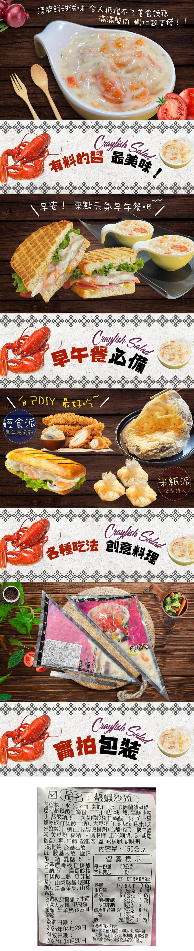 商品品名:螯蝦沙拉 商品組合/規格:1包 淨重、容量.(含液商品需標註固形物):150g±4.5% 內容物成分(全展開)成分有豬及牛的需於背後標註產地:水、沙拉油、素蝦仁(水、卡德蘭熱凝膠〔麥芽糊精、磷酸鈉、鹽〕、二氧化鈦、糖、鹽、高鮮味精〔L-麩酸鈉、5'-次黃嘌呤核苷磷酸鈉、5'-鳥嘌呤核苷磷酸鈉〕、大豆蛋白、辣椒紅色素(天然色素)]、蝦仁、品質改良劑(乙醯化己二酸二澱粉、黃豆粉、糊精、大瑪琳膠、玉米糖膠、β-胡蘿蔔素)、糖、白醋、螫蝦肉、鹽、飛魚卵、調味劑(氯化鈉、胺基乙酸、DL-胺基丙酸、琥珀酸二鈉、乳糖、5'-次黃嘌呤核苷磷酸鈉、5'-鳥嘌呤核苷磷酸鈉、麥芽糊精、山梨醇液(甜味劑)、洋香菜葉、山葵 原產地(國):台灣 製造廠商或國內負責廠商名稱:好神國際股份有限公司 製造廠商或國內負責廠商地址:新北市中和區新民街94巷11號 製造廠商或國內負責廠商電話:02-82267886 保存期限:冷凍保存12個月 食品業者登錄字號:H-154230747-00000-7 投保產品責任險字號:第一產物保險產品責任險保單號1000字第13PR000674號 過敏原:本產品含有大豆、蝦、魚卵、乳製品及其製品,不適合其過敏體質者食用 備註: 本產品屬"冷凍食品"無7天鑑賞期退換貨,敬請見諒。 好神國際所提供的產品配送區域範圍目前僅限台灣本島。 若商品無問題,因個人因素(口味、觀念、認知、料理方式問題),欲退換貨,需付物流處理費用250元,商品依溫層保存,外包裝保持原狀,如商品狀態受損者將影響退換貨權益。 商品顏色可能因各顯示器設定而有差異,依實際供貨商品為準。 基於食品衛生考量,除商品本身瑕疵外,商品一經拆封後,不可退貨,且退貨時請保留紙箱及商品,並於到貨後24小時內以電話、LINE@:@shg4038g或網站中的"聯絡我們",我們會盡全力協助您處理,謝謝。 商品之實際配貨日期、退換貨日期,依我們向您另行通知之內容為準。 收到退貨之商品且確認無誤後,7-14個工作天內辦理退款,款項將日回原訂購人或匯款轉帳人之帳號。