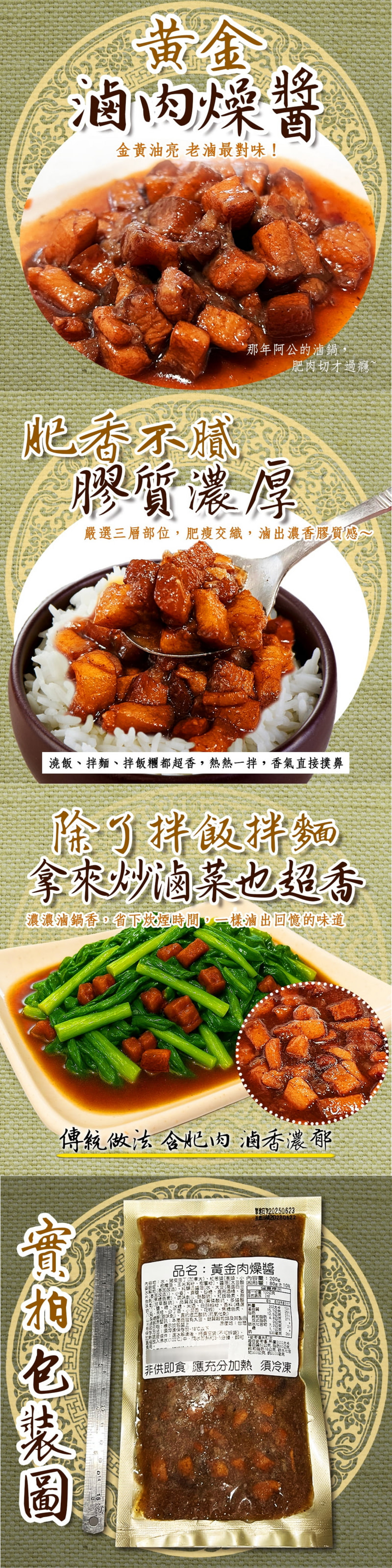 內容物成分(全展開)成分有豬及牛的需於背後標註產地:水、豬皮油丁(加拿大)、洋蔥頭(蔥頭、小蔥絲皮)、玉米澱粉、樹薯粉、醬油(大豆釀造)、水解醬(基因改造)、純釀造醬油〔水、大豆(高蛋白豆片/基因改造)、小麥、食鹽〕、砂糖、食用酒精、蒜、烏醋(焦糖色素)、調味劑(L-麩酸鈉)、紅麴色素、甜味劑(甘草酸鈉)、品質改良劑(偏磷酸鈉、多磷酸鈉)、鹽、糖、冰糖、米酒、白胡椒粉、香料(精選肉桂、公丁香、小茴香、花椒)、山梨醇(甜味劑)、異抗壞血酸鈉(抗氧化劑)
