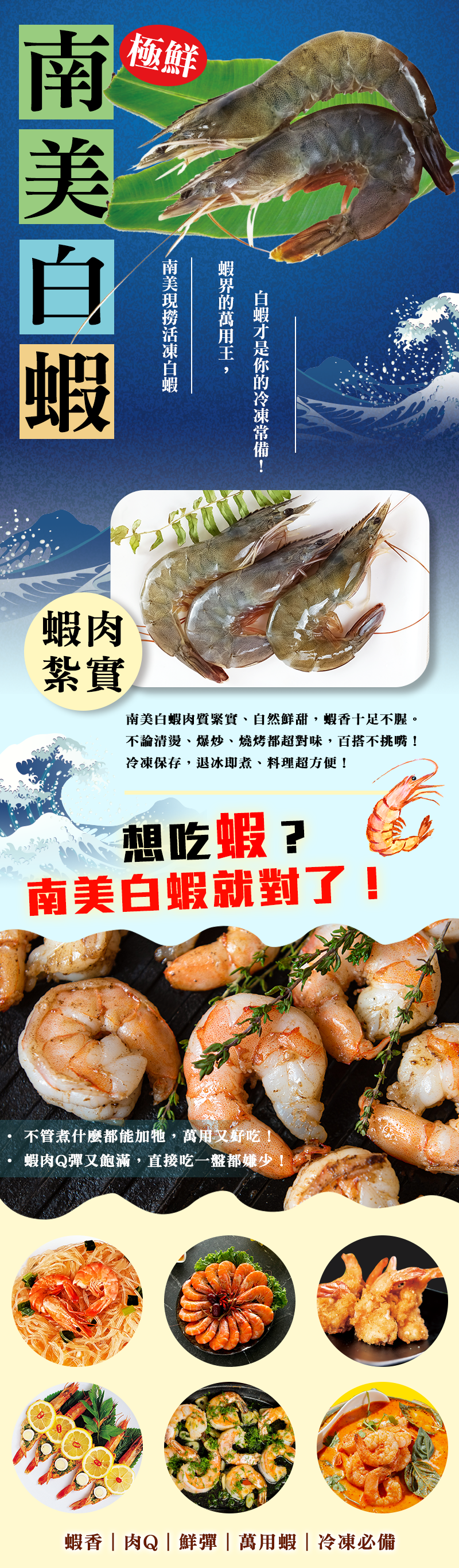嚴選來自南美潔淨海域的極鮮白蝦,採用活凍技術急速保鮮,完整鎖住鮮甜與彈牙口感。6/7 規格大尾尺寸,蝦肉厚實飽滿,料理後香氣濃郁、鮮味十足。適合火鍋、燒烤、清蒸或快炒等多種料理方式,無論家庭聚餐或宴客佳餚,都能展現蝦肉的自然鮮香與豪邁份量。冷凍包裝方便保存,無腥味、無添加,安心享受純粹海味。是餐桌上不可或缺的高品質海鮮食材。