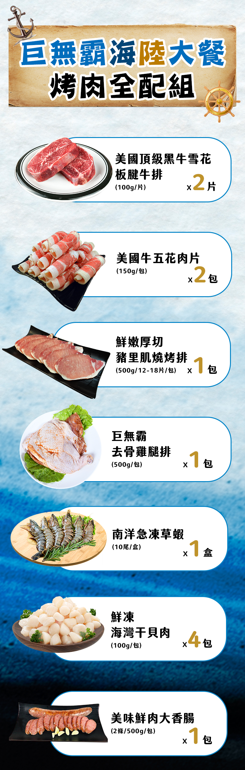 份量十足、滋味豐富!雙重美牛、豬里肌、去骨雞腿排、香腸,再搭配草蝦與干貝,讓你從開烤到收尾都不膩口。無需煩惱採買搭配,家庭派對、好友聚餐輕鬆搞定,一箱端出來就是烤肉王者! 商品品名: 巨無霸海陸大餐・烤肉全配組 商品組合/規格:美國頂級黑牛雪花板腱牛排(100g/片)2片、美國牛五花肉片(150g/包)2包、鮮嫩厚切豬里肌燒烤排(500g/包)1包、巨無霸去骨雞腿排(500g/片)1片、南洋急凍草蝦(10尾/盒)1盒、鮮凍海灣干貝肉(100g/包)4包、美味鮮肉大香腸(2條/500g/包)1包 淨重、容量.(含液商品需標註固形物):美國頂級黑牛雪花板腱牛排-100g±4.5%/片、美國牛五花肉片-150g±4.5%/包、 鮮嫩厚切豬里肌燒烤排-500g±3%/包、巨無霸去骨雞腿排-500g±3%/片、南洋急凍草蝦-10尾±220g9g/盒、鮮凍海灣干貝肉-100g±4.5%/包、美味鮮肉大香腸-2條/500g±3%/包 內容物成分(全展開)成分有豬及牛的需於背後標註產地: 美國頂級黑牛雪花板腱牛排-牛肉(美國) 美國牛五花肉片-牛肉(美國) 鮮嫩厚切豬里肌燒烤排-豬肉(美國/巴拉圭/加拿大) 巨無霸去骨雞腿排- 雞肉(美加)、砂糖、味素、蒜粉、洋蔥粉、多磷酸鈉、黑胡椒粉、白胡椒粉、匈牙利紅椒、麥芽糖胡精、香料(乙基麥芽醇二氧化矽、碳酸氫鈉、甘草素、氨基乙酸、DL-安基丙酸琥珀酸二鈉、5-次黃零和甘酸磷酸二鈉、5-飄零何干磷酸二鈉)玉米澱粉、蔗糖素 南洋急凍草蝦-草蝦 鮮凍海灣干貝肉-干貝 美味鮮肉大香腸-豬肉(台灣/加拿大/美國)、豬腸衣(台灣)、砂糖、大豆蛋白、鹽、五香粉(小茴香、肉桂、八角、丁香、花椒)、陳皮、白胡椒粉、麥芽糖糊精、醬油、洋蔥粉、丁香、肉桂、甘草、磷酸二澱粉、多磷酸鈉、L-麩酸鈉、胺基乙酸、DL-胺基丙酸、5'-鳥嘌呤核苷磷酸二鈉、5'-次黃嘌呤核苷磷酸二鈉、琥珀酸二鈉、異抗壞血酸鈉(抗氧化劑)、亞硝酸鈉、紅色40號、香料 原產地(國): 美國頂級黑牛雪花板腱牛排-美國 美國牛五花肉片-美國 鮮嫩厚切豬里肌燒烤排-美國/巴拉圭/加拿大 巨無霸去骨雞腿排-台灣 南洋急凍草蝦-越南 鮮凍海灣干貝肉-中國 美味鮮肉大香腸-台灣 製造廠商或國內負責廠商名稱:好神國際股份有限公司 製造廠商或國內負責廠商地址:新北市中和區新民街94巷11號 製造廠商或國內負責廠商電話:02-82267886 保存期限:冷凍保存12個月(有效日期: 標示於包裝上) 食品業者登錄字號:H-154230747-00000-7 投保產品責任險字號:第一產物保險產品責任險保單號1000字第13PR000674號 過敏原: 本產品含有大豆類、甲殼、貝類,不適合對其過敏者食用 ※由於肉品、海鮮及蔬菜等生鮮產品,天然生長大小本就有所差異,實際商品可能在外觀、形狀上略有不同。商品以「實際重量」為準,敬請理解並放心選購。 備註: 本產品屬""冷凍食品""無7天鑑賞期退換貨,敬請見諒。 生鮮冷凍肉品無法規格定重,重量在正負差範圍內,外觀大小皆略有不同,屬正常現象! 生鮮肉品皆為原裝進口原肉現切,故無任何添加及醃漬嫩化,如需軟嫰肉質,請自行斷筋及醃漬嫩化。 生鮮肉品因真空包裝缺氧,顏色呈暗紅色是正常現象。 宅配過程因商品碰撞可能導致失去真空效果,未退冰狀況下,並不影響商品的新鮮度,請放心食用! 海鮮類商品包冰比例請查看上方產品規格。 好神國際所提供的產品配送區域範圍目前僅限台灣本島。 若商品無問題,因個人因素(口味、觀念、認知、料理方式問題),欲退換貨,需付物流處理費用250元,商品依溫層保存,外包裝保持原狀,如商品狀態受損者將影響退換貨權益。 商品顏色可能因各顯示器設定而有差異,依實際供貨商品為準。 基於食品衛生考量,除商品本身瑕疵外,商品一經拆封後,不可退貨,且退貨時請保留紙箱及商品,並於到貨後24小時內以電話、LINE@:@shg4038g或網站中的""聯絡我們",我們會盡全力協助您處理,謝謝。 商品之實際配貨日期、退換貨日期,依我們向您另行通知之內容為準。 收到退貨之商品且確認無誤後,7-14個工作天內辦理退款,款項將日回原訂購人或匯款轉帳人之帳號。