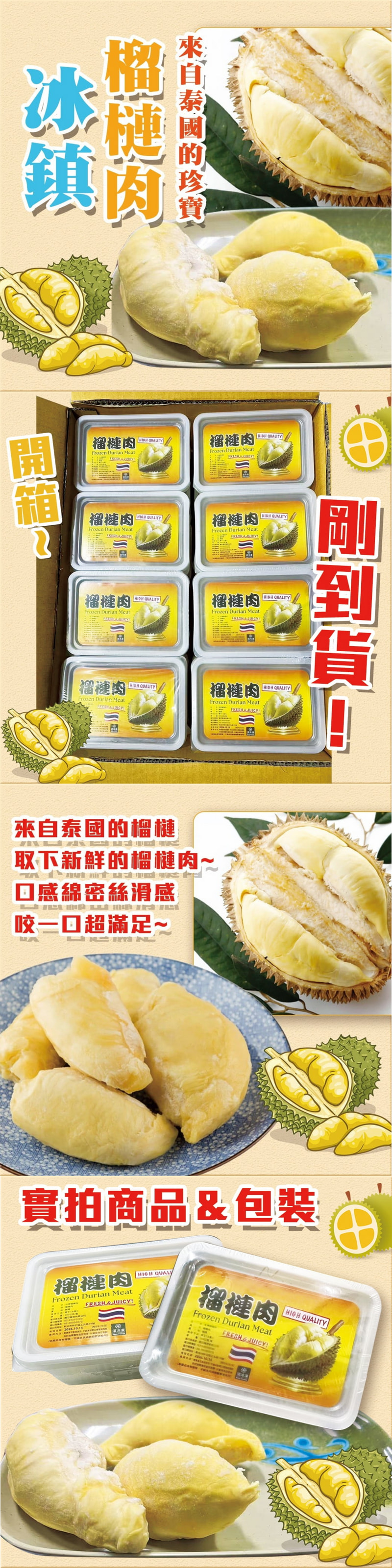 嚴選泰國金枕頭榴槤,果肉香甜濃郁,口感細膩綿滑,完整保留榴槤的獨特風味。採用急速冷凍鎖鮮技術,將新鮮果肉封存於最佳狀態,免去剝殼麻煩,打開即可享用。每盒300g,份量適中,無論單吃、搭配甜品、製作冰淇淋或蛋糕,都能增添濃濃南洋風情。冷凍保存讓您一年四季都能品嚐到榴槤的極致美味,方便又衛生,是榴槤愛好者的必備珍藏。 商品品名:冷凍榴槤肉 商品組合/規格:1盒 淨重、容量.(含液商品需標註固形物):300g±3%/盒 內容物成分(全展開)成分有豬及牛的需於背後標註產地:榴槤肉 原產地(國):泰國 製造廠商或國內負責廠商名稱:好神國際股份有限公司 製造廠商或國內負責廠商地址:新北市中和區新民街94巷11號 製造廠商或國內負責廠商電話:02-82267886 保存期限:冷凍保存 個月(有效日期: 標示於包裝上) 食品業者登錄字號:H-154230747-00000-7 投保產品責任險字號:第一產物保險產品責任險保單號1000字第13PR000674號 過敏原:無 備註: 本產品屬"冷凍食品"無7天鑑賞期退換貨,敬請見諒。 好神國際所提供的產品配送區域範圍目前僅限台灣本島。 若商品無問題,因個人因素(口味、觀念、認知、料理方式問題),欲退換貨,需付物流處理費用250元,商品依溫層保存,外包裝保持原狀,如商品狀態受損者將影響退換貨權益。 商品顏色可能因各顯示器設定而有差異,依實際供貨商品為準。 基於食品衛生考量,除商品本身瑕疵外,商品一經拆封後,不可退貨,且退貨時請保留紙箱及商品,並於到貨後24小時內以電話、LINE@:@shg4038g或網站中的"聯絡我們",我們會盡全力協助您處理,謝謝。 商品之實際配貨日期、退換貨日期,依我們向您另行通知之內容為準。 收到退貨之商品且確認無誤後,7-14個工作天內辦理退款,款項將日回原訂購人或匯款轉帳人之帳號。
