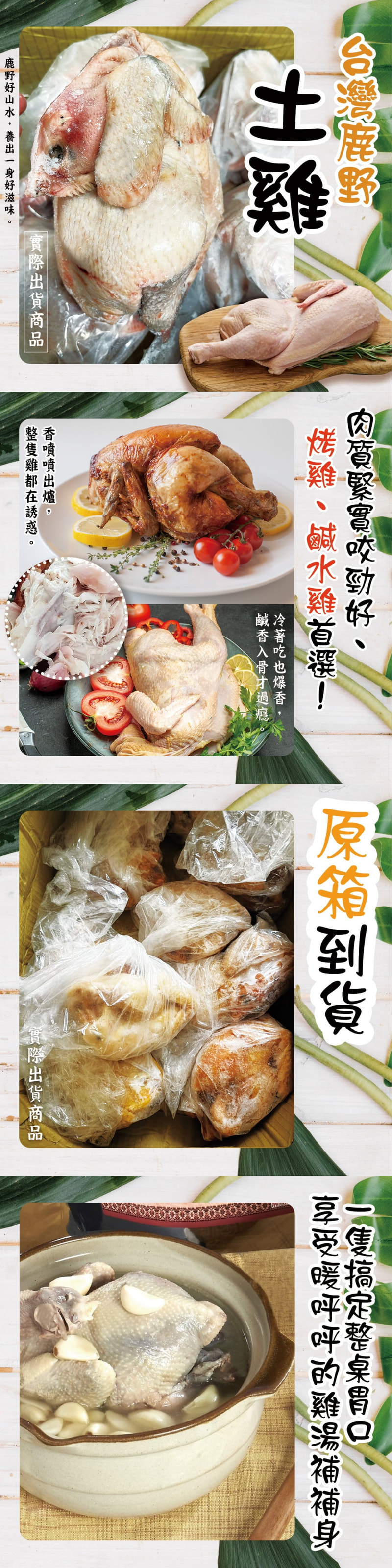 嚴選台東鹿野放養土雞,於自然環境中健康成長,活動量充足,使雞肉口感更加扎實Q彈,肉質鮮甜且不乾柴。整隻重量約900–1100g,大小適中,非常適合家庭料理與聚餐使用。無論是燉雞湯、白斬雞、三杯雞或燒烤料理,都能展現濃郁雞肉香氣與自然甘甜。鹿野土雞擁有經典古早味風味,雞肉纖維細緻、口感紮實,是許多老饕喜愛的優質食材。簡單料理即可呈現食材原味,讓餐桌輕鬆端出一道暖心又美味的家常佳餚。