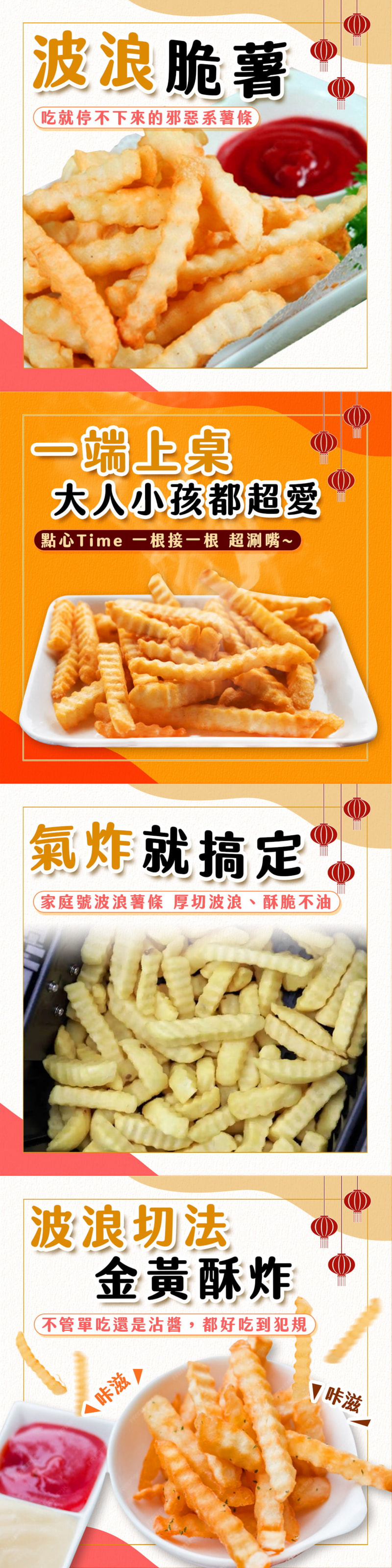 - 波浪造型更能吸附醬料,搭配番茄醬、蜂蜜芥末或起司醬皆美味