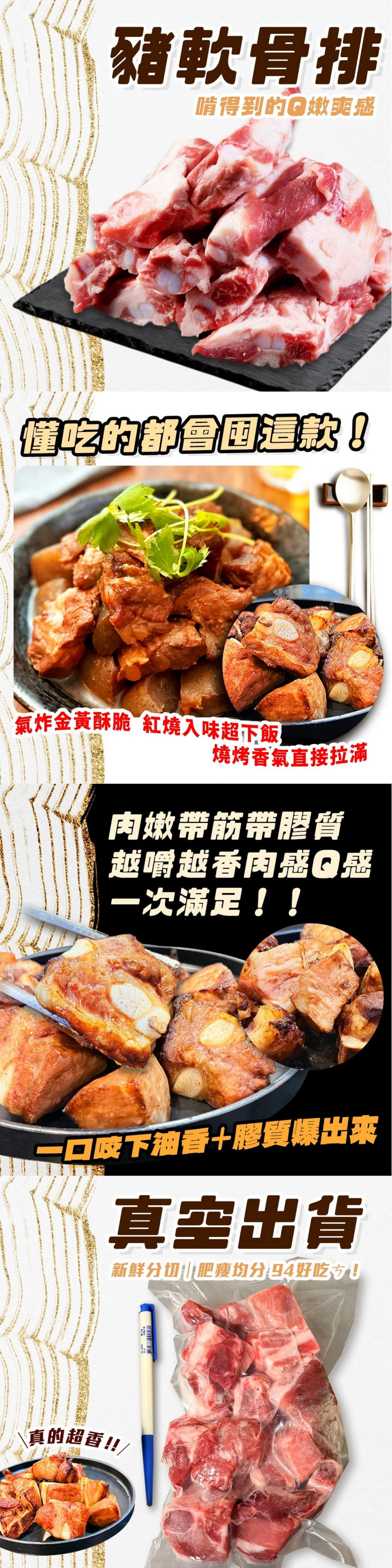 - 每頭豬僅有兩條,稀有珍貴 - 軟骨Q彈,肉質細嫩 - 富含膠原蛋白與鈣質 - 適合紅燒、燉湯、滷製或烤製 - 老少皆宜,滋補美味 頂級台灣豬軟骨排取自豬肋排下方稀有部位,每頭豬僅有兩條,極為珍貴。肉質柔軟細嫩,搭配Q彈白色軟骨,入口軟嫩又帶脆感,層次豐富。富含膠原蛋白與鈣質,燉煮後湯汁濃郁、冷卻即成膠凍,兼具美味與營養。500g×2包份量適中,適合家庭共享。用途廣泛,無論是紅燒、清燉、滷製或烤製,都能展現獨特風味。特別適合老人與小孩食用,是餐桌上兼具滋補與美味的佳餚選擇。 商品品名:豬軟骨排 商品組合/規格:2包 淨重、容量.(含液商品需標註固形物):500g ± 3% 包 內容物成分(全展開)成分有豬及牛的需於背後標註產地:豬肉(台灣) 原產地(國):台灣 製造廠商或國內負責廠商名稱:好神國際股份有限公司 製造廠商或國內負責廠商地址:新北市中和區新民街94巷11號 製造廠商或國內負責廠商電話:02-82267886 保存期限:冷凍保存12個月(有效日期: 標示於包裝上) 食品業者登錄字號:H-154230747-00000-7 投保產品責任險字號:第一產物保險產品責任險保單號1000字第14PR000651號 過敏原: 不適合對其過敏者食用 ※由於肉品、海鮮及蔬菜等生鮮產品,天然生長大小本就有所差異,實際商品可能在外觀、形狀上略有不同。商品以「實際重量」為準,敬請理解並放心選購。 ※ 非供即食,應充分加熱 備註: 本產品屬"冷凍食品"無7天鑑賞期退換貨。 基於食品衛生考量,除商品本身瑕疵外,商品一經拆封後,不可退貨,且退貨時請保留紙箱及商品,並於到貨後24小時內以電話、LINE@:@shg4038g或網站中的"聯絡我們",我們會盡全力協助您處理,謝謝。 生鮮肉品皆為原裝進口原肉現切,故無任何添加及醃漬嫩化,如需軟嫰肉質,請自行斷筋及醃漬嫩化。 生鮮肉品因真空包裝缺氧,顏色呈暗紅色是正常現象。 宅配過程因商品碰撞可能導致失去真空效果,未退冰狀況下,並不影響商品的新鮮度,請放心食用! 好神國際所提供的產品配送區域範圍目前僅限台灣本島。 若商品無問題,因個人因素(口味、觀念、認知、料理方式問題),欲退換貨,需付物流處理費用250元,商品依溫層保存,外包裝保持原狀,如商品狀態受損者將影響退換貨權益。 商品顏色可能因各顯示器設定而有差異,依實際供貨商品為準。 商品之實際配貨日期、退換貨日期,以通知之內容為準。 收到退貨之商品且確認無誤後,7-14個工作天內辦理退款。