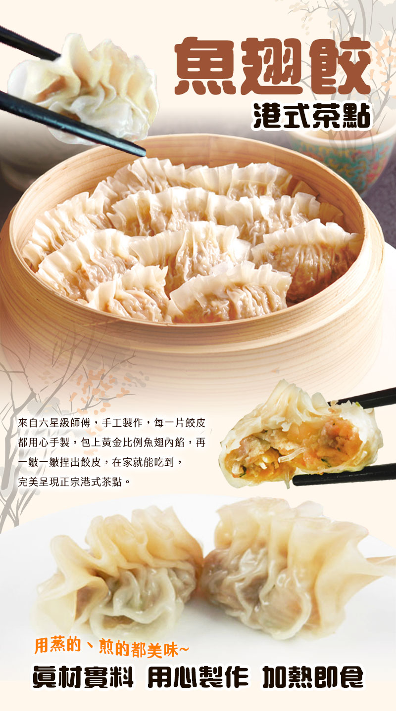 港式茶樓經典魚翅餃,採用晶瑩Q彈餃皮包裹滿滿鮮香內餡,呈現道地港式手工點心風味。雖名為「魚翅餃」,實為以多種海鮮與食材製作,口感鮮美豐富,入口香氣四溢。適合蒸煮加熱,輕鬆還原茶樓現做美味,不論是下午茶、家庭聚會或宴客小點,都能展現餐桌品味。方便保存、快速上桌,是港式點心愛好者的必備佳品。