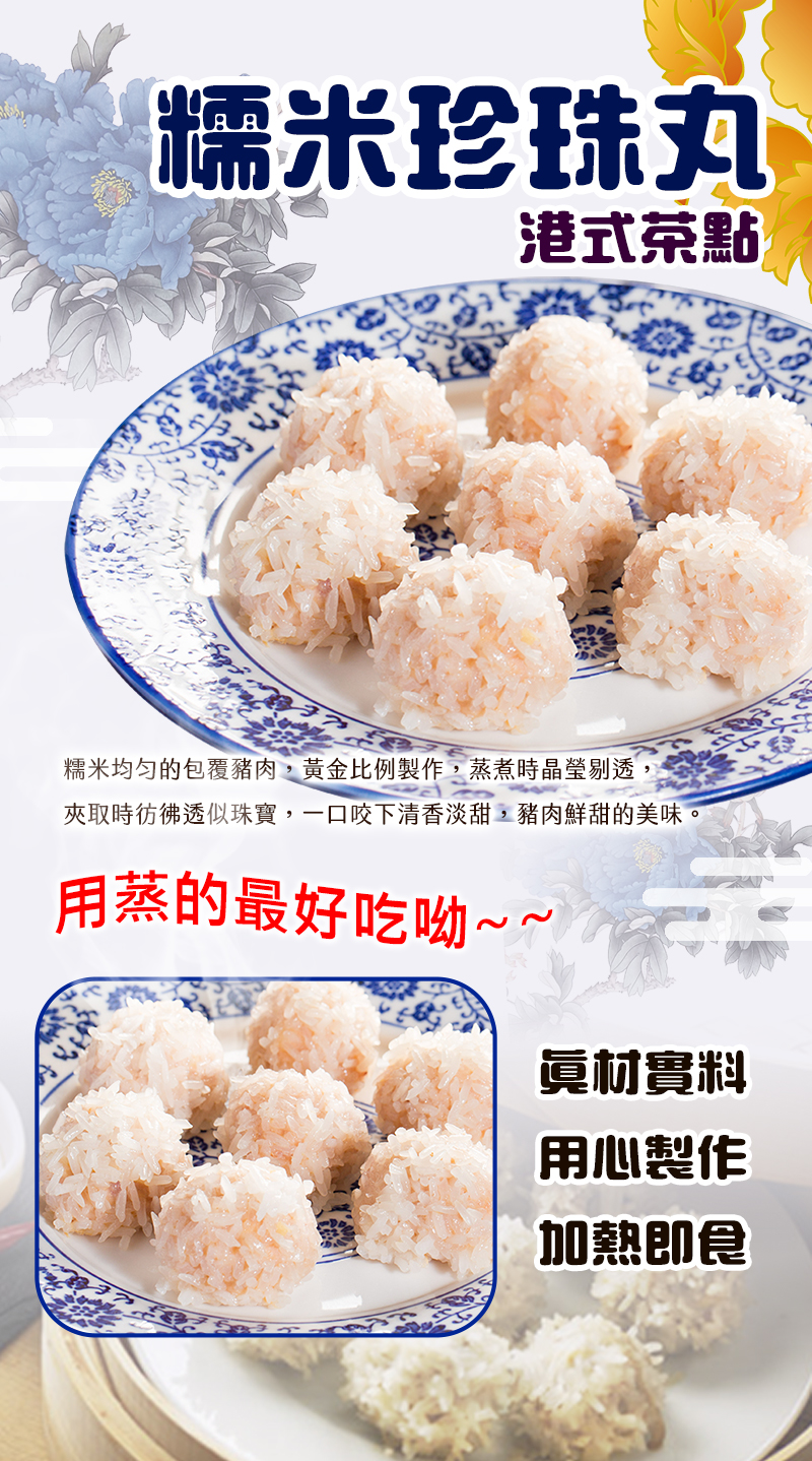 港式經典糯米珍珠丸,採用糯米包裹鮮美內餡,外層晶瑩軟糯,入口Q彈,香氣十足。每顆珍珠丸皆以手工精製,蒸煮加熱即可輕鬆享用道地茶樓風味。無論作為早餐、下午茶點心或宴客小菜,都能帶來香糯可口的經典港式滋味。方便保存與料理,讓您在家也能輕鬆品嚐正宗港點,兼具美味與便利,是港式點心愛好者的理想選擇。