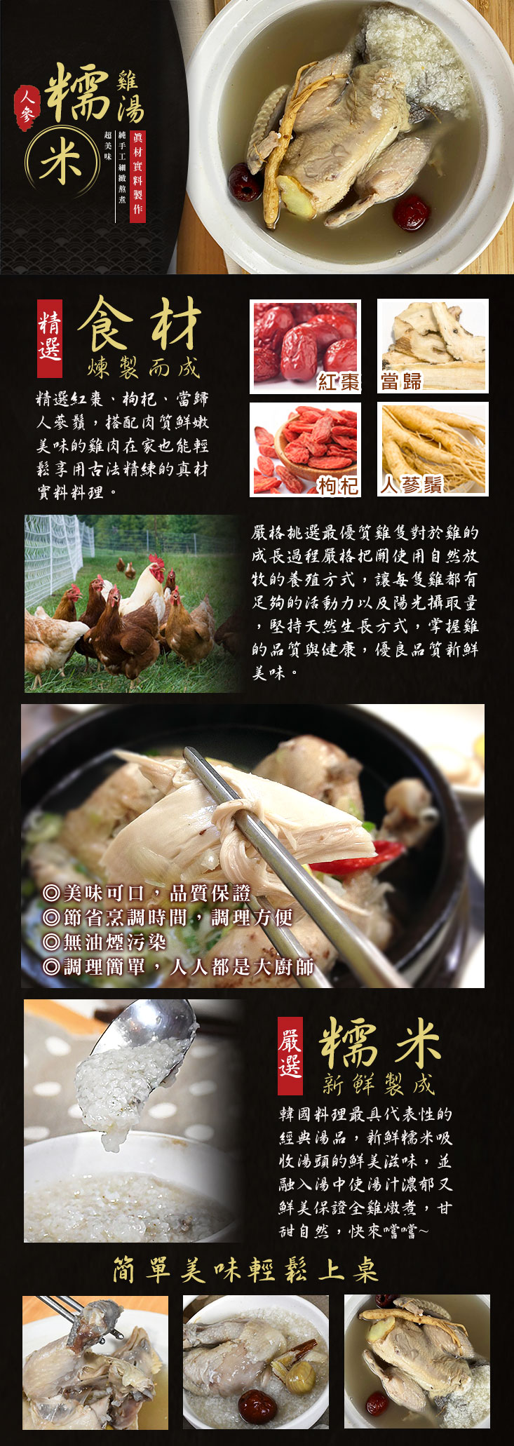 【人蔘糯米全雞湯】嚴選鮮嫩全雞,內餡填入Q彈糯米與紅棗、枸杞等養生食材,再加入韓國高麗參與老薑細火慢燉,湯頭清香回甘、雞肉軟嫩入味,糯米吸飽湯汁,口感綿密又滋補。每一口都是暖心滋味,適合全家共享。以急速冷凍技術封存鮮美營養,只需加熱即可享受滿滿元氣。無論寒冬進補、聚會宴客或日常養身,這款全雞湯都是您的最佳選擇!